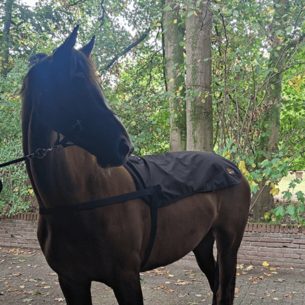 - Pasvorm: De vorm en ligging van de rugwarmer kunnen bij veel beweging verschuiven. Door de rugwarmer onder een zweetdeken te plaatsen, blijft deze stabiel liggen, zelfs tijdens korte verplaatsingen.