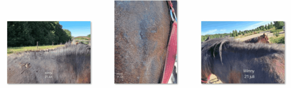 “Vanaf eind juni zijn we gestart met het aanbrengen van PruZenn. In het begin dagelijks. Na 1 week was bij ons ‘ergste’ paard al te zien dat de huid rustiger werd”.