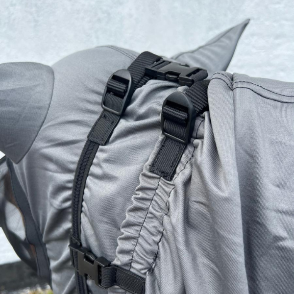 De deken is voorzien van flexibele inzetstukken bij de schouders en de hals, waardoor je paard voldoende bewegingsvrijheid heeft. Verder heeft de deken een verstelbaar elastiek bij de hals en een brede, elastische buikflap. Deze zorgt voor een nauwsluitende en veilige pasvorm zonder ongemak. De verstelbare bescherming tussen de voorbenen en de grote staartflap bieden uitstekende bescherming tegen irriterende beten van muggen.